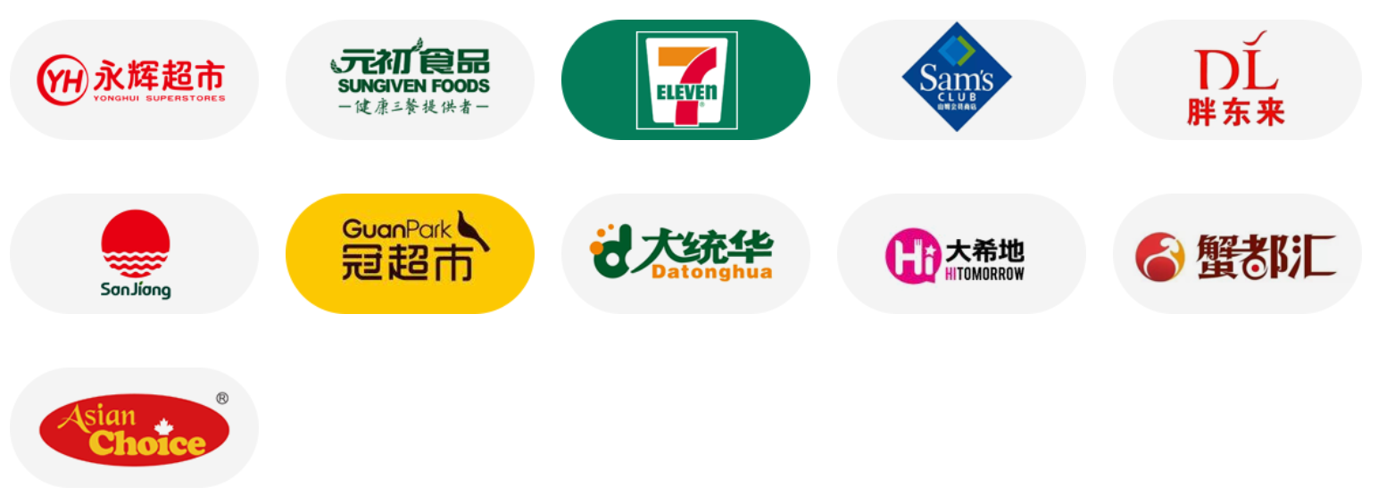 零售客戶:永輝超市、元初食品、7-11便利店、山姆大叔、胖東來、三江購物、冠超市、大統華、大希地、蟹都匯、Asian Choice